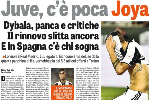 Gazzetta dello Sport: “Juve, c’è poca Joya. Dybala, panca e critiche. Il rinnovo slitta ancora. E in Spagna c’è chi sogna…”