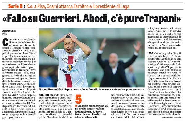 Gazzetta dello Sport: “K.o. a Pisa, Cosmi attacca l’arbitro e il presidente di Lega: «Fallo su Guerrieri. Abodi, c’è pure Trapani»”