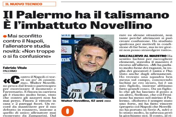 “«Contro il Napoli ci vorrà un po’ di cazzimma». Walter Novellino pesca dal lessico partenopeo per esorcizzare il momento e l’avversario. E finora in carriera gli è riuscito molto bene, visto che contro gli azzurri non ha mai perso. Finora 2 vittorie in casa e 2 pareggi fuori. Un record da mantenere per il suo debutto in rosanero, insieme a quello di unico allenatore mai esonerato da Zamparini. Dal Venezia al Palermo, 16 anni dopo di nuovo insieme. «L’ho trovato più giovane e carico, ma anche più allenatore – dice ridendo –. Lo conosco dal 1998, non gli ho chiesto niente di particolare. Lui sa chi sono. C’è un rapporto di stima, mi ha sempre fatto lavorare tranquillamente. Resta il fatto che un presidente può dire la sua. Cercherò di vincere o almeno pareggiare tutte le partite che mancano, di sicuro non voglio perdere. La voglia di rientrare era tanta, ho lasciato la Serie A 7 anni fa, ho avuto molte richieste in B, ma ho aspettato e ho fatto bene. Non voglio deludere il presidente e il pubblico di Palermo». Va bene la cazzimma, ma non solo. Novellino vuole vedere una squadra opportunista, determinata, e anche qualche accorgimento tattico basilare che funzioni. «Credo molto nelle motivazioni di ogni giocatore. La prima cosa che devono pensare è fare una grande partita sotto l’aspetto caratteriale – spiega –. La priorità sarà agire sulla testa dei giocatori. Dobbiamo però lavorare su alcune situazioni, non tante perché altrimenti si può creare confusione. Ho studiato qualcosa per metterli in condizione di far bene, ma in tre giorni non posso stravolgere tutto». DALL’ALLIEVO AL MAESTRO Ha sentito Iachini per raccogliere elementi, stavolta il maestro è ricorso all’allievo. «Mi ha parlato molto bene dei ragazzi, la voglia dei giocatori è tanta e l’ho visto anche dagli allenamenti. Ho trovato una squadra ben messa sul campo, conoscendo Iachini ne ero sicuro, lui è un mio figliolo, insieme abbiamo fatto grandi cose». Da un figliolo che gli ha lasciato il posto a un altro, Stellone, che col Frosinone ha messo nel mirino il Palermo. «Roberto è sempre stato uno forte, mi ha fatto vincere (proprio col Napoli che Novellino ha portato in Serie A, ndr) e lo stimo molto, la salvezza però la giochiamo noi. Il conto, al ristorante, si paga sempre alla fine». Stasera però c’è il Napoli di Sarri da contenere. VAZQUEZ FAI TU Novellino parte dalle certezze Gilardino e Vazquez a quali affiancherà il dinamismo di Quaison. «Gila è importante come tutti i nostri giocatori. Vazquez tatticamente può fare quello che vuole. L’indifferenza dei tifosi? Sono venuto con entusiasmo e voglio che si perda questa indifferenza. E’ una parola mi dà fastidio e sono convinto che possiamo farla dimenticare con buoni risultati»”. Questo quanto si legge sull’edizione odierna de “La Gazzetta dello Sport”.