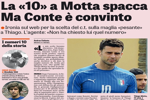 Gazzetta dello Sport: “La «10» a Motta spacca, ma Conte è convinto. L’agente: «Non ha chiesto lui quel numero»”