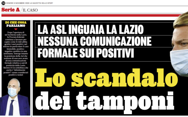 Gazzetta dello Sport: “La Asl inguaia la Lazio. Nessuna comunicazione formale sui positivi. Lo scandalo dei tamponi”