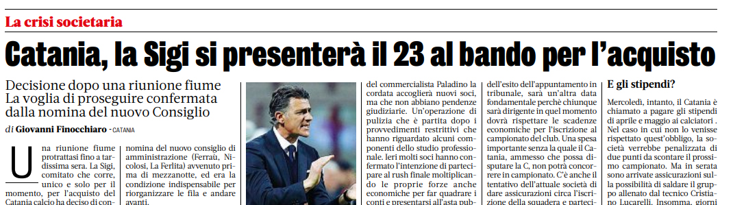 L’edizione odierna de la “Gazzetta dello Sport”, si sofferma sull’attuale situazione societaria in casa Catania. Ieri prima della riunione tenutasi in tarda serata, la Sigi ha fatto sapere, tramite Maurizio Pellegrino, che nell’organigramma ha un ruolo di direzione tecnica, che dopo l’arresto del commercialista Paladino la cordata accoglierà nuovi soci, ma che non abbiano pendenze giudiziarie. In città non si parla d’altro da mesi e mesi. Il 5 agosto, al di là dell’esito dell’appuntamento in tribunale, sarà un’altra data fondamentale perchè chiunque sarà dirigente in quel momento dovrà rispettare le scadenze economiche per l’iscrizione al campionato del club. Mercoledì, intanto, il Catania è chiamato a pagare gli stipendi di aprile e maggio ai calciatori. Nella serata di ieri, scrive il quotidiano sportivo, sono arrivate assicurazioni in tal senso.