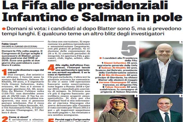Gazzetta dello Sport: “La Fifa alle presidenziali, Infantino e Salman in pole. Ecco tutti i candidati, qualcuno teme un altro blitz degli investigatori…”
