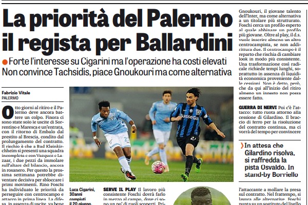 Gazzetta dello Sport: “La priorità del Palermo, il regista per Ballardini. Forte l’interesse su Cigarini, ma l’operazione ha costi elevati” – le ultime