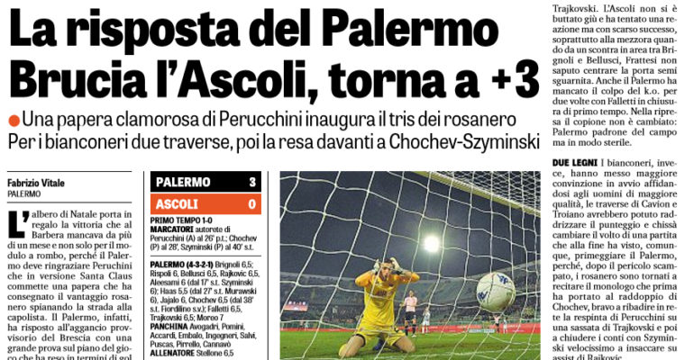 “L’albero di Natale porta in regalo la vittoria che al Barbera mancava da più di un mese e non solo per il modulo a rombo, perché il Palermo deve ringraziare Peruchini che in versione Santa Claus commette una papera che ha consegnato il vantaggio rosanero spianando la strada alla capolista. Il Palermo, infatti, ha risposto all’aggancio provvisorio del Brescia con una grande prova sul piano del gioco che ha reso in termini di gol soltanto nella ripresa. L’Ascoli non è sembrato quello in versione ammazza grandi, lo stesso che aveva fermato Brescia, Cittadella e Pescara e aveva battuto Verona, Benevento e Lecce.