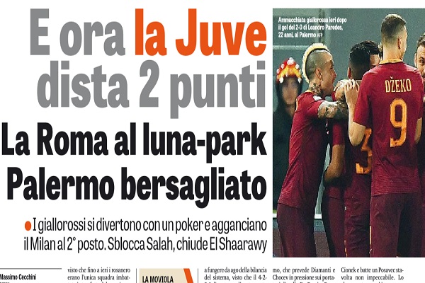 Gazzetta dello Sport: “La Roma al luna-park, Palermo bersagliato. E ora la Juve dista due punti”
