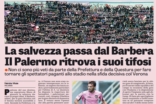 Gazzetta dello Sport: “La salvezza passa dal Barbera. Il Palermo ritrova i suoi tifosi. Attesi 30 mila spettatori per la sfida di domenica”