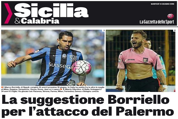 Marco Borriello, ultima idea di Zamparini. L’attaccante piace al patron per quanto fatto vedere col Carpi prima e all’Atalanta poi. Se hai Alberto Gilardino in rosa e cerchi Borriello è la conferma che l’amore tra il numero uno rosanero e il campione del mondo non è mai scoccato. Del resto, ci sono le esternazioni del patron durante il campionato appena concluso a testimoniare quante volte Gila sia stato messo in discussione, oltre alle pressioni sui vari allenatori affinché partisse dalla panchina a beneficio di Trajkovski e Djurdjevic cui avrebbe dovuto fare da chioccia. Il “Vedremo” con cui il presidente ha chiosato sul futuro del centravanti la scorsa settimana non lascia dubbi. Poi, però, ci sono i numeri e dicono che Gilardino, pur in una stagione travagliata, ha messo a segno 10 gol pesantissimi per la salvezza.  MOTIVI La verità è che Gila paga il fatto di non essere stato, l’estate scorsa, un’idea partorita da Zamparini, ma una necessità a cui ricorrere quando il mercato stava chiudendo e le strategie in tema di attaccanti non avevano prodotto risultati dopo le cessioni di Dybala e Belotti. Quest’anno un attaccante di esperienza servirà: Nestorovski, per quanto sia il capocannoniere del campionato croato, deve dimostrare il suo valore in A. Ecco allora l’idea Borriello che Zamparini ritiene più mobile e in condizioni migliori di Gilardino, nonostante siano coetanei, compiranno 34 anni. Gli uomini mercato rosanero si stanno muovendo per l’attaccante che si svincolerà a parametro zero, approfittando anche dei buoni uffici di Beppe Corti, braccio destro di Foschi e fino a quest’anno a Bergamo. L’eventuale arrivo di Borriello presuppone la partenza di Gila. NODI Zamparini ha detto agli agenti del giocatore di trovargli una sistemazione. Il Pescara potrebbe pensare a Gila come sostituto di Lapadula. A favorire l’operazione i buoni rapporti tra Massimo Oddo e l’attaccante, i due sono stati compagni nel Milan e in Nazionale con la quale sono diventati campioni del mondo 10 anni fa. Ci sono dei nodi da sciogliere: prima di tutto l’ingaggio di Gilardino che per altri 2 anni percepirà circa 1 milione di euro a stagione, un onere economico pesante per una neopromossa come gli abruzzesi. Poi c’è da considerare lo stipendio di Borriello che non sarà leggero, visto che si libera senza alcun costo per il suo cartellino. Boriello, nel mirino anche dell’Udinese, quest’anno ha guadagnato quasi 800 mila euro a stagione. Inoltre il rendimento dei due attaccanti è stato molto simile, anche se Gilardino ha segnato due gol in più rispetto all’atalantino. La macchina operativa, comunque, è già partita e quando Zamparini “s’innamora” di un giocatore fa di tutto per prenderlo”. Questo quanto si legge sull’edizione odierna de “La Gazzetta dello Sport”.