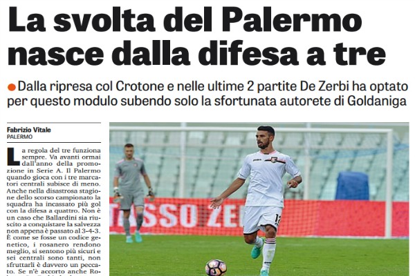 Gazzetta dello Sport: “La svolta del Palermo nasce dalla difesa a tre. Dalla ripresa col Crotone De Zerbi ha optato per questo modulo, subendo solo la sfortunata autorete di Goldaniga”