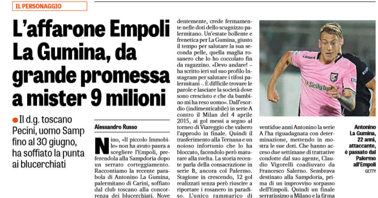 Il palermitano La Gumina va all’Empoli. Ecco quanto scrive “La Gazzetta dello Sport” a riguardo: “Nino, «Il piccolo Immobile» non ha avuto paura a scegliere l’Empoli, preferendola alla Sampdoria dopo un serrato corteggiamento. Raccontiamo la recente parabola di Antonino La Gumina, palermitano di Carini, soffiato dal club toscano alla concorrenza dei blucerchiati. Nove milioni di euro versati al Palermo,una cifra record investita dal presidente Corsi che, evidentemente, crede fermamente nelle doti dello scugnizzo palermitano. Un’estate bollente e frenetica per La Gumina, giusto il tempo per salutare la sua seconda pelle, quella maglia rosanero che lo ho coccolato fin da ragazzino. «Devo andare! –  ha scritto ieri sul suo profilo Instagram per salutare i tifosi palermitani -. È difficile trovare le parole e lasciare la società dove sono cresciuto e che da bambino mi ha reso uomo». Dall’esordio (indimenticabile) in serie A contro il Milan del 4 aprile 2015, ai gol messi a segno al torneo di Viareggio che valsero l’approdo in finale. Quindi il trasferimento alla Ternana e un noioso infortunio che lo ha bloccato, facendolo però maturare alla svelta. La storia recente parla della consacrazione in serie B, ancora col Palermo. Stagione in crescendo, 12 gol realizzati senza però riuscire a riportare i rosanero in paradiso. L’unico rammarico di un’estate memorabile.