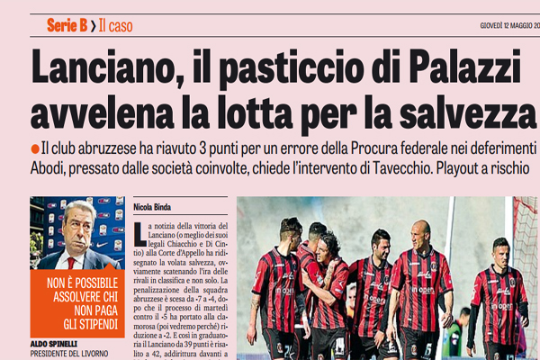 Gazzetta dello Sport: “Lanciano, il pasticcio di Palazzi avvelena la lotta per la salvezza. Il club abruzzese ha riavuto 3 punti per un errore della Procura federale nei deferimenti. Abodi…”