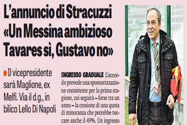 Gazzetta dello Sport: “L’annuncio di Stracuzzi: «Un Messina ambizioso. Tavares sì, Gustavo no». Il vicepresidente sarà Maglione, ex Melfi. Via il d.g., in bilico Lello Di Napoli”