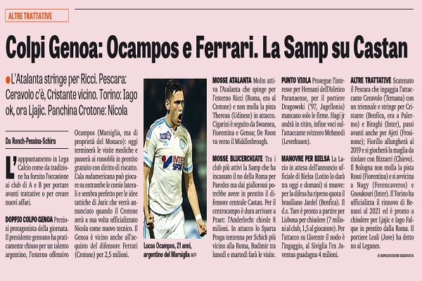 “L’appuntamento in Lega Calcio come da tradizione ha fornito l’occasione ai club di A e B per portare avanti trattative o per creare nuovi affari. DOPPIO COLPO GENOA Preziosi protagonista della giornata. Il presidente genoano ha praticamente chiuso per un talento argentino, l’esterno offensivo Ocampos (Marsiglia, ma di proprietà del Monaco): oggi terminerà le visite mediche e passerà ai rossoblù in prestito gratuito con diritto di riscatto. L’ala sudamericana può giocare su entrambe le corsie laterali e sembra perfetto per le idee tattiche di Juric che verrà annunciato quando il Crotone avrà a sua volta ufficializzato Nicola come nuovo tecnico. Il Genoa è vicino anche all’acquisto del difensore Ferrari (Crotone) per 2,5 milioni. MOSSE ATALANTA Molto attiva l’Atalanta che spinge per l’esterno Ricci (Roma, era al Crotone) e non molla la pista Thereau (Udinese) in attacco. Cigarini è seguito da Swansea, Fiorentina e Genoa; De Roon va verso il Middlesbrough. MOSSE BLUCERCHIATE Tra i club più attivi la Samp che ha incassato il no della Roma per Paredes ma dai giallorossi potrebbe avere in prestito il difensore centrale Castan. Per il centrocampo è dura arrivare a Praet: l’Anderlecht chiede 8 milioni. In attacco lo Sparta Praga tentenna per Schick più vicino alla Roma, Budimir tra lunedì e martedì farà le visite. PUNTO VIOLA Prosegue l’interesse per Hernani dell’Atletico Paranaense, per il portiere Dragowski (’97, Jagellonia) mancano solo le firme. Hagi jr andrà in ritiro, infine voci sull’attaccante svizzero Mehmedi (Leverkusen). MANOVRE PER BIELSA La Lazio in attesa dell’annuncio ufficiale di Bielsa (Lotito lo darà tra oggi e domani) si muove: per la difesa ha ripreso quota il brasiliano Jardel (Benfica). Il d.s. Tare è pronto a partire per Lisbona per chiudere (7 milioni al club, 1,5 al giocatore). Per l’attacco su Llorente il nodo è l’ingaggio, al Siviglia l’ex Juventus guadagna 4 milioni. ALTRE TRATTATIVE Scatenato il Pescara che ingaggia l’attaccante Ceravolo (Ternana) con un triennale e stringe per Cristante (Benfica, era a Palermo) e Biraghi (Inter), passi avanti anche per Ajeti (Frosinone); Fiorillo allungherà al 2019 e si giocherà la maglia da titolare con Bizzarri (Chievo). Il Bologna non molla la pista Rossi (Fiorentina) e si avvicina a Nagy (Ferencaveros) e Gnoukouri (Inter). Il Torino ha ufficializza il rinnovo di Benassi al 2021 ed è pronto a chiudere per Ljajic e Iago Falque in prestito dalla Roma. Il portiere Leali (Juve) ha detto no al Leganes”. Questo quanto si legge sull’edizione odierna de “La Gazzetta dello Sport”.