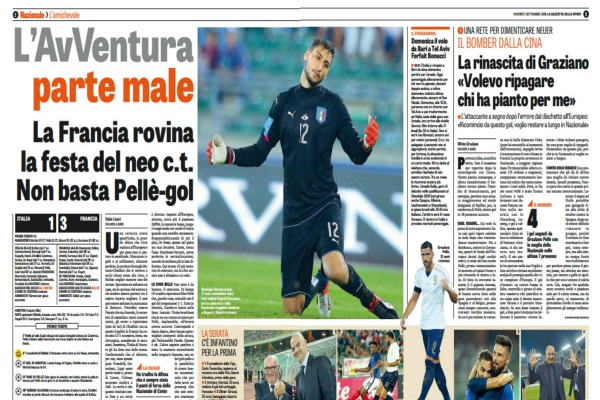 Gazzetta dello Sport: “L’AvVentura parte male. La Francia rovina la festa del neo c.t. Non basta Pellè-gol”