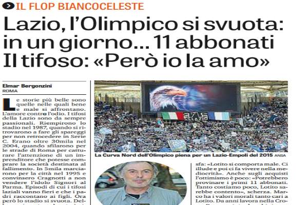 Gazzetta dello Sport: “Lazio, l’Olimpico si svuota: in un giorno… 11 abbonati. Il tifoso: «Però io la amo»”