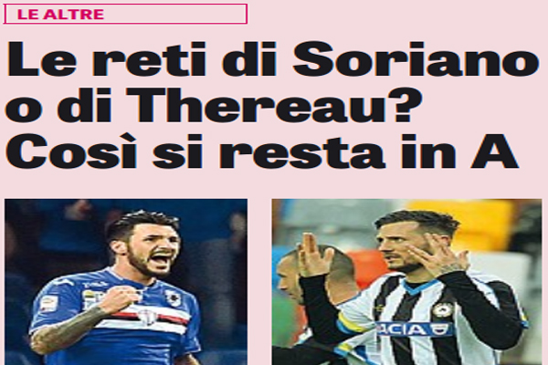 “C’erano un capitano, un bomber, un fantasista e l’idolo di una curva. No, non è una barzelletta, perché nella volata salvezza a chi perde toccano le lacrime. Se il Palermo ha in Maresca una nuova carta per restare aggrappato alla Serie A, Samp, Udinese, Carpi e Frosinone calano i loro assi. RECORD Roberto Soriano griffò la stracittadina di Genova con una doppietta all’andata. I gufi dicono sia in calo, ma a Palermo è stato uno dei pochi della Samp a salvare la faccia. Otto gol in campionato (record personale), il capitano blucerchiato si troverà di nuovo di fronte il Genoa domenica. Chissà che porti fortuna. In classifica la Sampdoria è quella messa meglio tra le pericolanti con 40 punti e a rigor di logica potrebbe anche salvarsi perdendo derby e ultima con la Juve. Ma la testa di un guerriero come Soriano non fa calcoli. Nella sua migliore annata di sempre in Serie A, vuole levarsi di torno i brividi il prima possibile. Magari segnando e vincendo con i cugini. Può diventare una stagione da record anche per Cyril Thereau. L’attaccante francese dell’Udinese ha già pareggiato il suo miglior score in Italia (11 reti al Chievo nel 201213): un gol nelle prossime due e il gioco è fatto. Postilla per i fantacalcisti: degli 11 gol segnati da Thereau, ben 7 sono stati realizzati fuori casa. Se l’Udinese dovesse vincere a Bergamo probabile sia lui a mettere la firma. Anche se potrebbe non bastare a salvarsi. CLASSE… OPERAIA È arrivato a gennaio, ha giocato poco a causa degli infortuni. Eppure Simone Verdi è l’arma in più del Carpi per la volata finale. Diciamocelo: nella squadra di Castori nessuno ha la sua qualità. E infatti quando è stato disponibile, Verdi è sceso puntualmente in campo. Si è rivisto con la Juve, dove solo uno straordinario Buffon gli ha negato la gioia del gol. Assai probabile sia titolare anche contro la Lazio alla prossima. Chi è mancato per alcune settimane al Frosinone è Federico Dionisi, idolo della curva, omaggiata con il gesto della bevuta dopo ogni rete. Contro il Milan è tornato a segnare: un gol che senza il 33 finale dei rossoneri avrebbe alimentato ancor di più la fiamma della speranza al Matusa. Ora siamo al lumicino. Dopo il Sassuolo servirà una birra per dimenticare?”. Questo quanto riporta l’edizione odierna de “La Gazzetta dello Sport”.