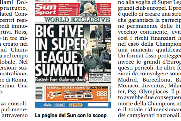 “I cinque club inglesi che martedì si sono riuniti in una sala riservata dell’hotel Dorchester per parlare del progetto della nuova Super Lega Europea sono stati intercettati dal Sun e ieri il tabloid britannico ha sparato la notizia nella controcopertina, con le fotografie dei dirigenti presenti. I nomi: il britannico Edward Woodward, 44 anni, amministratore delegato del Manchester United; lo spagnolo Ferran Soriano, 48, a.d. del Manchester City; il sudafricano Ivan Gazidis, 51, direttore esecutivo dell’Arsenal ed ex vicecommissario della Major League Soccer; l’avvocato statunitense Bruce Buck, presidente del Chelsea; l’inglese Ian Ayre, 52, CEO del Liverpool. I cinque, ben sintonizzati per origini o cultura con il sistema Usa, hanno incontrato il miliardario statunitense Stephen Ross, 75 anni, proprietario del club di football americano Miami Dolphins, ma, soprattutto, fondatore della Related Companies, società di centri residenziali di lusso, fondi immobiliari e eventi sportivi. Ross, patrimonio stimato in tre miliardi di sterline, ha creato nel 2003 l’International Champions Cup, diventata nel tempo un evento estivo globale. Nel 2015, ha avuto tre versioni: statunitense, cinese e australiana, con la partecipazione di Roma, Inter, Milan e Fiorentina. Una Champions di luglio. FORMAT L’esperienza consolidata e il denaro che può mettere in campo Ross attraverso contratti tv da favola si sposano alla voglia di Super Lega dei grandi club europei. Il progetto è quello di creare una struttura che garantisca la partecipazione permanente delle big del vecchio continente, evitando così i rischi finanziari legati, nel caso della Champions, ad una mancata qualificazione. Un format fisso proteggerebbe invece le grandi d’Europa da questi pericoli. Le altre formazioni da coinvolgere sono Real Madrid, Barcellona, Bayern Monaco, Juventus, Milan, Inter, Psg, Olympiacos. Il progetto avrebbe due conseguenze: la morte della Champions attuale e il totale ridimensionamento dei campionati nazionali. REAZIONI I media britannici si sono subito scagliati contro la Super Lega Europea: la Premier non si tocca. Le reazioni dei diretti interessati sono invece all’insegna della massima diplomazia. L’Uefa fa sapere che era a conoscenza della riunione di Londra, mentre l’Arsenal, unico dei club presenti ad aprire bocca, dichiara: «Siamo contrari a qualsiasi fuga, l’incontro di martedì è servito solo a mettere a punto una serie di proposte per modificare la coppe europee da sottoporre successivamente all’Uefa». Davvero vogliono farci credere alle favole?“. Questo quanto riportato dall’odierna edizione de “La Gazzetta dello Sport”.