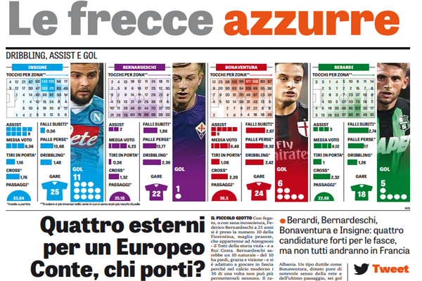 “Tutti e quattro assieme sommano appena venti minuti giocati nella Nazionale di Antonio Conte, lo spezzone di amichevole contro l’Albania disputato da Bonaventura nell’autunno del 2014. Tre dei quattro – Berardi, Bernardeschi e Insigne – con l’attuale c.t. non hanno mai visto il campo. Difficile che vadano tutti all’Europeo, ma almeno due hanno buone possibilità di entrare nei 23. A nessuno difettano le qualità. Casomai, per qualcuno, i problemi sembrano di altra natura. Ecco il borsino delle quattro nuove frecce tricolori. IL MISTERIOSO Nessuno dubita della consistenza tecnica di Domenico Berardi. Il giovane dà il meglio di sé come punta esterna nel 4-3-3 di Di Francesco al Sassuolo, ma ci pare compatibile con il calcio di Conte, per esempio come ala d’attacco nel 4-2-4 «contiano». Le perplessità sono di natura psicologica. Il ragazzo ogni tanto perde la brocca e si fa espellere. Eppoi stenta a uscire dal guscio emiliano: ha preso tempo per il trasferimento alla Juve e in ottobre ha lasciato Coverciano per infortunio, nella prima e fin qui unica volta in cui Conte lo ha chiamato in Nazionale. Non vogliamo dire che fingesse, ma tutti sanno che lo stoicismo – il restare in gruppo anche se non si sta bene – è valore apprezzato dal c.t. Qual è il vero Berardi? Per lui, freccia giù. IL PICCOLO GIOTTO Con fegato, o con sana incoscienza, Federico Bernardeschi a 21 anni si è preso la numero 10 della Fiorentina, maglia pesante, che appartenne ad Antognoni – il Totti della storia viola – e a Rui Costa. Bernardeschi sarebbe un 10 naturale – del 10 ha piedi, grazia e visione – e si è adattato a giocare in fascia perché nel calcio moderno i 10 di una volta non può più permetterseli nessuno. Il ragazzo ha mostrato umiltà e spirito di sacrificio. Non si è arroccato dietro il suo talento, ma lo ha messo al servizio degli altri. Pennella come un piccolo Giotto e dà copertura a 70-80 metri di terreno. Conte non l’ha mai chiamato, neppure per fargli assaporare l’aria della Nazionale vera, però lo fa seguire con assiduità. L’Under 21 non andrà all’Olimpiade e Bernardeschi sarà convocabile per Euro 2016. Per lui, freccia su. L’UNIVERSALE Giacomo Bonaventura, per tutti «Jack» e basta, incarna il classico universale: dove lo metti, gioca. Un trasformista che sa recitare un sacco di parti in commedia. Può ricoprire tutti i ruoli del centrocampo, per dire. Mihajlovic oggi lo utilizza come esterno sinistro nell’economia del 4-4-2 che ha rivitalizzato il Milan. In effetti ci sembra misterioso che Conte lo abbia convocato una sola volta, a novembre del 2014, per le partite contro Croazia e Albania. Un tipo duttile come Bonaventura, dotato pure di notevole senso della rete e dell’ultimo passaggio, sei gol e sei assist per lui in questo campionato, fa la felicità di qualunque allenatore. Per lui, freccia su. IL MIGLIORE Lo dicono i numeri, Lorenzo Insigne oggi è il miglior giocatore italiano della Serie A: 11 gol e 9 assist rappresentano uno strepitoso bottino, destinato a crescere. Nel 4-3-3 di Sarri, Insigne è diventato esterno a tutto tondo, capace di sostenere le due fasi senza problemi. Così risulta incomprensibile che il piccolo genio di Frattamaggiore non abbia ancora giocato un minuto nella Nazionale di Conte. Si spera che l’incomprensione d’ autunno – Insigne, come Berardi, via dal ritiro per guarire a casa da un infortunio – sia stata superata. Ci aspettiamo che il c.t. convochi Insigne per le due amichevoli di lusso a fine marzo, contro Spagna e Germania. Se ciò non accadesse, sarebbe lecito porsi delle domande «dietrologiche». Per Lorenzito, freccia su. Molto su”. Questo quanto si legge sull’edizione odierna de “La Gazzetta dello Sport”.