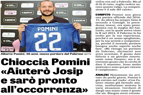 Gazzetta dello Sport: “Le mani del Palermo. Chioccia Pomini: «Aiuterò Josip e sarò pronto all’occorrenza»”