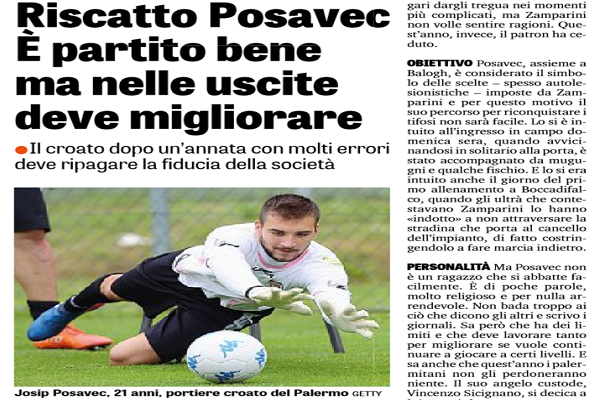 L’edizione odierna de “La Gazzetta dello Sport” dedica ampio spazio ai portieri in rosanero. Josip Posavec, il pupillo di Zamparini in cerca di consacrazione, ma ancora con tante cose da migliorare. Ecco quanto si legge: