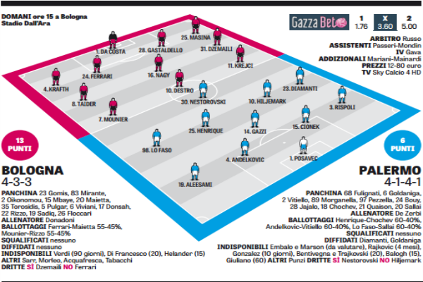 Domani alle 15 allo stadio “Renato Dall’Ara” andrà in scena il match tra Bologna e Palermo, sfida valida per la 13^ giornata del campionato di serie A. I rosanero militano nei bassissimi fondi della classifica con soli 6 punti, decisamente meglio i felsinei che fin qui hanno totalizzato 13 punti. Ecco le probabili formazioni del match de “La Gazzetta dello Sport”: