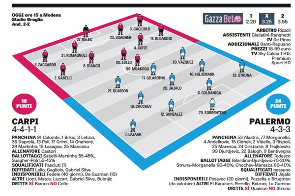Gazzetta dello Sport: le probabili formazioni di Carpi-Palermo