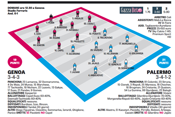 L’edizione odierna de “La Gazzetta dello Sport” ha stilato le probabili formazioni di Genoa-Palermo, gara in programma domani alle 12.30. In alto le ptoenziali scelte dei due tecnici.