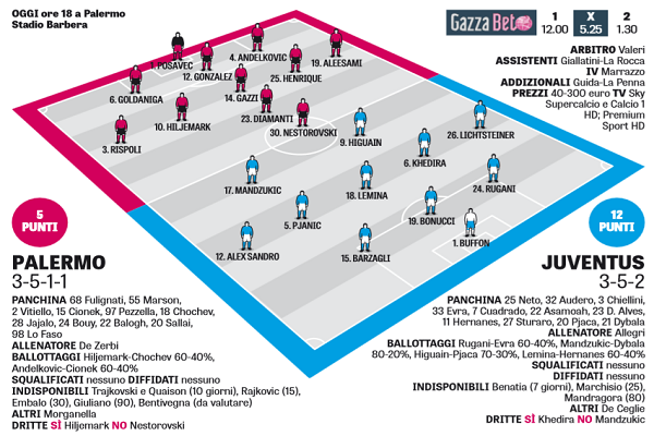 L’edizione odierna de “La Gazzetta dello Sport” ha stilato le probabili formazioni del match in programma oggi alle ore 18 al “Renzo Barbera” tra Palermo e Juventus. In alto le potenziali scelte dei due tecnici.