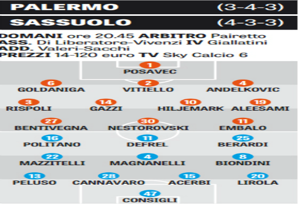 L’edizione odierna de “La Gazzetta dello Sport” ha stilato le probabili formazioni di Palermo-Sassuolo, match in programma domani sera al “Renzo Barbera”. Di seguito le potenziali scelte dei due tecnici: