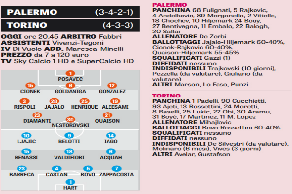 Gazzetta dello Sport: le probabili formazioni di Palermo-Torino