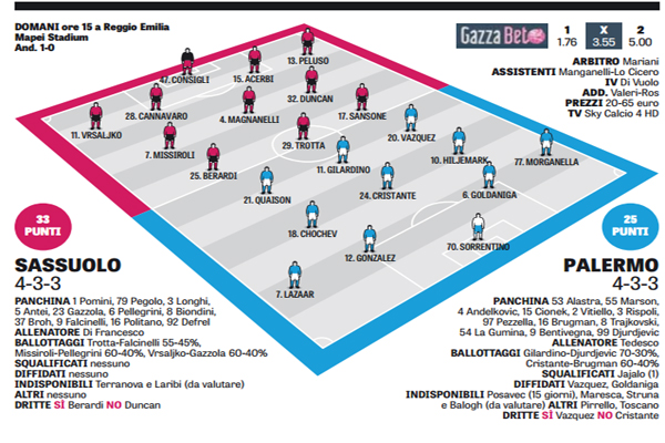 L’edizione odierna de “La Gazzetta dello Sport” ha stilato le probabili formazioni del match in programma domani tra Sassuolo e Palermo. Saranno due i principali cambi nell’undici targato Tedesco–Schelotto: il primo vede l’impiego di Cristante in regia al posto dello squalificato Jajalo, l’ex Benfica inoltre secondo il quotidiano è in vantaggio su Brugman per una maglia da titolare; l’altro è la partenza dal 1′ di Michel Morganella a prendere il psoto dell’infortunato Struna.