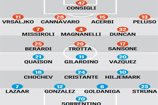 Secondo l’edizione odierna de “La Gazzetta dello Sport” un solo cambio verrà apportato alla formazione titolare del Palermo nel match di domenica contro il Sassuolo, ovvero Cristante a sostituire lo squalificato Jajalo. Per il resto la coppia Tedesco–Schelotto dovrebbe confermare la squadra vista nelle precedenti uscite. Di seguito le potenziali scelte: