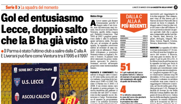 L’edizione odierna della “Gazzetta dello Sport”, parla del campionato del Lecce che da neopromossa sta puntando dritta alla A. Il doppio salto, è riuscito 19 volte nella storia del calcio italiano, l’ultima a riuscirci è stato il Parma tra il 2016 e il 2018. Ma anche il Benevento, riuscì nell’impresa di passare subito nella massima serie dopo il primo campionato di B della sua storia. Il Lecce di Liverani, proverà a entrare in questo speciale “club” che comprende a quota uno Lucchese, Varese, Bari, Brescia, Cagliari, Bologna, EMpoli, Modena Genoa, Napoli, Cesena, Novara, Benevento e Parma. Stando al presente però, nonostante il 7-0 rifilato all’Ascoli, i salentini non hanno il miglior attacco visto che il Brescia, con una partita in meno, ha segnato 5 volte in più. Tra le squadra in lotta per la serie A inoltre, è la difesa più bucata. A partire dai gol di La Mantia, si può pensare dunque al doppio salto per i pugliesi.