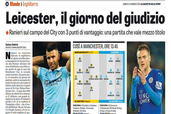 Gazzetta dello Sport: “Leicester, il giorno del giudizio. Ranieri sul campo del City con 3 punti di vantaggio: una partita che vale mezzo titolo”