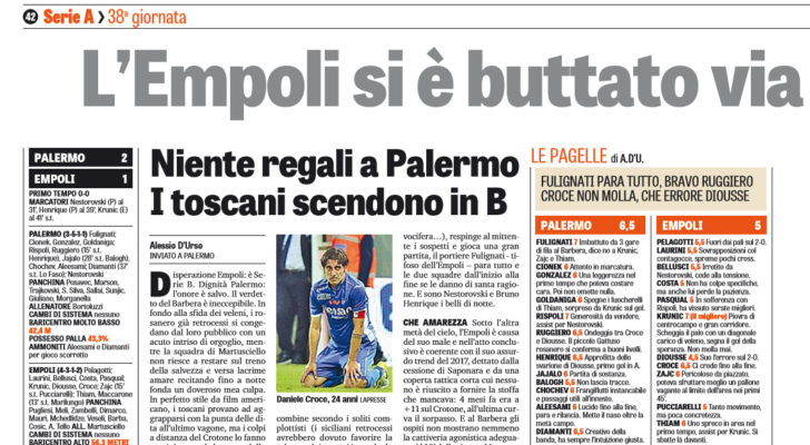 “Disperazione Empoli: è Serie B. Dignità Palermo: l’onore è salvo. Il verdetto del Barbera è ineccepibile. In fondo alla sfida dei veleni, i rosanero già retrocessi si congedano dal loro pubblico con un acuto intriso di orgoglio, mentre la squadra di Martusciello non riesce a restare sul treno della salvezza e versa lacrime amare recitando fino a notte fonda un doveroso mea culpa. In perfetto stile da film americano, i toscani provano ad aggrapparsi con la punta delle dita all’ultimo vagone, ma i colpi a distanza del Crotone lo fanno precipitare nel dramma della retrocessione a mille chilometri da casa, in una notte che nessuno avrebbe potuto immaginare fino a qualche settimana fa. PARACADUTE E SOSPETTI Eppure nella gara dei mille sospetti e addirittura del rischio combine secondo i soliti complottisti (i siciliani retrocessi avrebbero dovuto favorire la salvezza dei toscani in modo da percepire oltre ai 25 milioni di paracadute già garantiti anche gli altri 15 restanti in caso di mancata promozione nel prossimo campionato di B), il campo scrive alla fine una sua sentenza chiara: Diamanti, in odor di trasferimento all’Empoli (si vocifera…), respinge al mittente i sospetti e gioca una gran partita, il portiere Fulignati ­ tifoso dell’Empoli – para tutto e le due squadre dall’inizio alla fine se le danno di santa ragione. E sono Nestorovski e Bruno Henrique i belli di notte. CHE AMAREZZA Sotto l’altra metà del cielo, l’Empoli è causa del suo male e nell’atto conclusivo è coerente con il suo assurdo trend del 2017, dettato dalla cessione di Saponara e da una coperta tattica corta cui nessuno è riuscito a fornire la stoffa che mancava: 4 mesi fa era a +11 sul Crotone, all’ultima curva il sorpasso. E al Barbera gli ospiti non mostrano nemmeno la cattiveria agonistica adeguata. Al 12’ della ripresa Maccarone spreca davanti a Fulignati, poi Krunic colpisce il palo: i gol mangiati sono la fotografia del match dei toscani e il preludio all’amaro finale. Non bastano il graffio dello stesso Krunic e l’ultimo assalto di Bellusci dopo le due sberle inferte dal Palermo: troppo tardi. Si compie così un suicidio sportivo in piena regola: dopo 3 anni, i toscani ritornano in B. Giù la testa.”. Questo quanto riportato da “La Gazzetta dello Sport”.