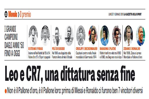 Gazzetta dello Sport: “Leo e CR7, una dittatura senza fine. Non è il Pallone d’oro, è il Pallone loro”