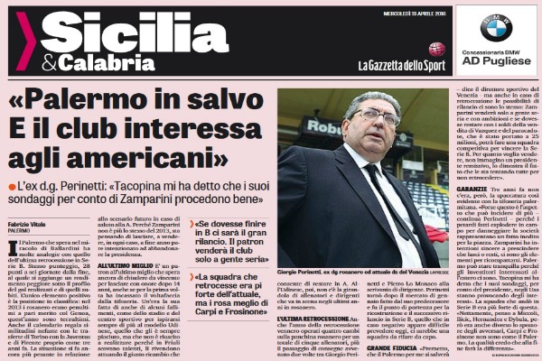 Gazzetta dello Sport: “L’ex d.g. Perinetti: «Palermo in salvo E il club interessa agli americani. Tacopina mi ha detto…»