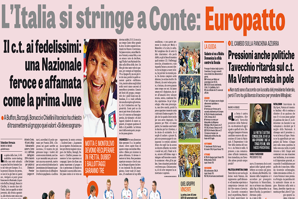 Gazzetta dello Sport: “L’Italia si stringe a Conte: Europatto. Il c.t. ai fedelissimi: una Nazionale feroce e affamata come la prima Juve”