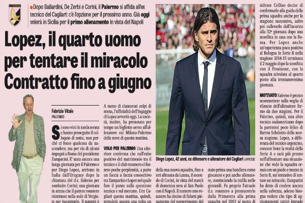 “Si sono visti in tarda serata e hanno proseguito il colloquio di notte, non perché ci fosse qualcosa da nascondere, ma per via di alcuni impegni a Roma del presidente Zamparini. E’ stata ancora una lunga giornata per il Palermo e per Diego Lopez, arrivato in Italia dall’Uruguay dopo la chiamata del d.s. Salerno per sostituire Corini; una giornata in attesa che il patron rosanero rientrasse nella sede di Vergiate per incontrarlo. Il summit è servito al presidente per conoscere meglio l’uruguayano e per discutere dell’accordo che dovrebbe legare il tecnico al Palermo sino a giugno con un’opzione per la prossima stagione. A meno di clamorosi colpi di scena, l’ufficialità dell’ingaggio di Lopez avverrà oggi. La società, inoltre, ha prenotato per tempo un biglietto aereo all’allenatore sul MilanoPalermo delle nove di questa mattina. VOLO PER PALERMO Una ulteriore conferma che sull’esito positivo del matrimonio tra il tecnico e il club rosanero ci fossero poche perplessità, a parte un faccia a faccia conoscitivo tra Zamparini e Lopez nel quale fare il punto sulla questione tecnica e sul mercato. L’ex Cagliari questa mattina, quindi, prenderà ancora una volta un aereo per il capoluogo siciliano dopo essere arrivato in Italia ieri all’ora di pranzo al termine di un lungo viaggio che lo ha portato da Montevideo a Milano, e dirigerà il primo allenamento della sua nuova squadra, fino a ieri allenata da Lanna, il secondo di Corini, in vista del match di domenica sera al San Paolo con il Napoli. Il numero uno rosanero ha deciso di fidarsi pienamente del suggerimento del suo direttore sportivo. DI NUOVO INSIEME Salerno conosce molto bene Lopez fin dai tempi in cui ha lavorato al Cagliari, dove l’uruguayano è stato prima una bandiera come giocatore e poi anche allenatore, cominciando la trafila nelle giovanili. Fu proprio l’attuale d.s. rosanero a promuoverlo dalla Primavera alla prima squadra nel 2012 al posto di Ficcadenti. Lopez, affiancato dal tutor Pulga, condusse i sardi verso la salvezza con sei giornate di anticipo, ben figurando alla sua prima esperienza su una panchina di A. L’allora presidente Cellino decise di confermarlo alla guida della prima squadra anche per la stagione successiva, salvo poi sollevarlo dall’incarico alla 32ª giornata dopo una sconfitta in casa con la Roma. Per Lopez anche un’esperienza poco positiva al Bologna in Serie B nella stagione 201415 terminata il 2 maggio dopo la sconfitta con il Frosinone, con la squadra scivolata al quarto posto alla trentanovesima giornata. MOTIVATO Salerno è pronto scommettere sulla voglia di rilancio dell’allenatore fermo da due stagioni. Per il Palermo, quindi, una altro tecnico sudamericano dopo la parentesi poco felice di Barros Schelotto della scorsa stagione. Lopez, a differenza del tecnico argentino, conosce bene la realtà della Serie A e sarà più pronto nell’affrontare una situazione che vede la squadra ormai con un piede e mezzo in Serie B, nel tentativo di tentare un miracolo. Zamparini ha detto di credere ancora nella salvezza, adesso bisogna vedere che tipo di aggiustamenti tattici intende apportare Lopez alla squadra. Molto dipenderà dai rinforzi che arriveranno in questi ultimi giorni di mercato.”. Questo quanto si legge su “La Gazzetta dello Sport”.