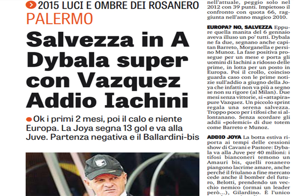 “Era iniziato con la più imponente goleada dell’ultimo decennio, il 5-0 sul Cagliari di Zola, si è concluso con l’ennesimo k.o. di una stagione disgraziata, lo 0-2 con la Sampdoria. Il 2015 a tinte rosanero è finito. Meno male… Già, perché gli ultimi 12 mesi hanno riservato al Palermo e ai suoi tifosi molte più amarezze che gioie. Dal sogno Europa League di metà febbraio dopo il 3-1 sul Napoli ai due mesi senza successi, dall’esplosione di Dybala alla certezza del suo addio a fine stagione. A suon di milioni – certo – ma senza un valido sostituto. Una salvezza senza troppa gioia. E poi le difficoltà del campionato in corso culminate nell’esonero di Iachini, nell’«espulsione» di Rigoni e compagni e nell’eliminazione choc dalla Coppa Italia con l’Alessandria (Lega Pro). LA CRISI La riprova arriva dai numeri, con 45 punti conquistati in campionato, il 2015 è il secondo peggior anno solare dell’era Zamparini (come nel 2008): 27 punti nella seconda parte del torneo 2014-15, 18 nell’attuale, peggio solo nel 2012 con 39 punti. Impietoso il confronto con quota 66, raggiunta nell’anno magico 2010. EUROPA? NO, SALVEZZA Eppure quella manita del 6 gennaio aveva illuso un po’ tutti. Dybala ne fa due, segnano anche capitan Barreto, Morganella e persino Munoz. La fase positiva prosegue per un mese e porta gli uomini di Iachini a ridosso delle prime, in lotta per un posto in Europa. Poi il crollo, coinciso guarda caso con le prime notizie sull’addio a giugno della Joya che infatti non va più a segno se non su rigore (al Milan). Due mesi senza vittorie, si «attapira» pure Vazquez. Un piccolo sprint regala una serena salvezza. Troppo poco per i tifosi che si allontanano. Senza scordare gli addii «polemici» di due totem come Barreto e Munoz. ADDIO JOYA La botta estiva riporta ai tempi delle cessioni show di Cavani e Pastore: Dybala va alla Juve per 40 milioni: i tifosi bianconeri temono un Amauri bis, quelli rosanero piangono lacrime amare, anche perché il friulano a fine mercato cede anche il bomber del futuro, Belotti, prendendo un vecchio nemico (ormai un leader però…), Gilardino. È l’unico grande acquisto di un mercato al risparmio e con tanti «no» incassati da campioni, talenti e mezzi giocatori: i conti non tornano e in campionato, dopo l’illusorio due su due in avvio, segue una lunga striscia nera che porta all’addio di un tecnico amato, Iachini. NUOVA ERA Nel mezzo le liti con Zamparini, un ritiro punitivo e rari sprazzi di gioia fino alla nuova scommessa Ballardini che però parte con tre k.o. in cinque gare e il clamoroso tonfo di Coppa con l’Alessandria: via per scelta tecnica Maresca, Rigoni e Daprelà. Fuori anche El Kaoutari, ultrà contro tutti (all’attacco di Zamparini e in contrasto tra loro). Si chiude a +4 sulla zona B, capitan Sorrentino che prova a far remare tutti dalla stessa parte per evitare che la barca si capovolga come nel terribile 2012-13 e con la speranza che il mercato di gennaio porti nomi in grado di contribuire a risalire la china. 45 ● I punti nel 2015: 27 tra gennaio e maggio, 18 nella prima parte della stagione in corso. Con Zamparini peggio solo nel 2012 con 39 punti”. Questo quanto si legge sull’edizione odierna de “La Gazzetta dello Sport”.