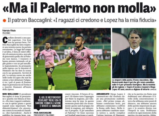 Gazzetta dello Sport: “«Ma il Palermo non molla». Il patron Baccaglini: «I ragazzi ci credono e Lopez ha la mia fiducia»”