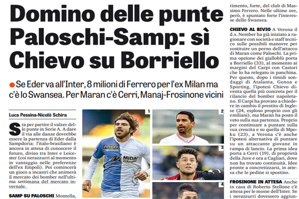 Gazzetta dello Sport, mercato serie A: “Domino delle punte. Paloschi-Samp: sì. Chievo su Borriello. Per Maran c’è Cerri, Manaj-Frosinone vicini”