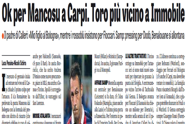 Gazzetta dello Sport, mercato serie A: “Ok per Mancosu a Carpi. Toro più vicino a Immobile”