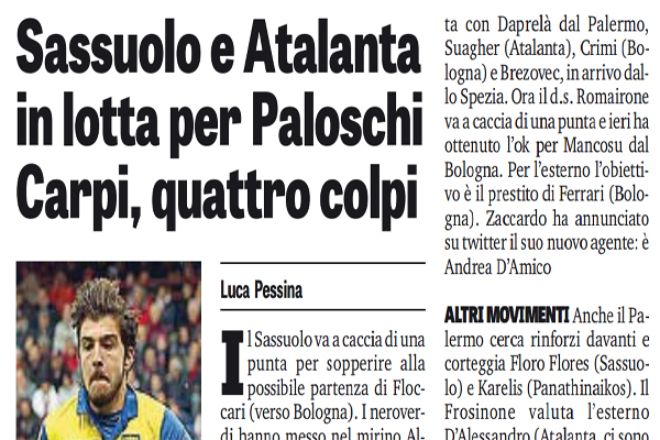 Il Sassuolo va a caccia di una punta per sopperire alla possibile partenza di Floccari (verso Bologna). I neroverdi hanno messo nel mirino Alberto Paloschi (Chievo), per cui ci sono stati contatti prima di un’offerta vera e propria. I gialloblù non vorrebbero privarsene a gennaio e chiedono più di 5 milioni. Se Squinzi vorrà portare Paloschi da Di Francesco dovrà però battere la concorrenza dell’Atalanta. Intanto prosegue la caccia a Murru (Cagliari) e rinnova Missiroli fino al 2019. COLPI CARPI I biancorossi chiudono 4 affari in una giornata con Daprelà dal Palermo, Suagher (Atalanta), Crimi (Bologna) e Brezovec, in arrivo dallo Spezia. Ora il d.s. Romairone va a caccia di una punta e ieri ha ottenuto l’ok per Mancosu dal Bologna. Per l’esterno l’obiettivo è il prestito di Ferrari (Bologna). Zaccardo ha annunciato su twitter il suo nuovo agente: è Andrea D’Amico ALTRI MOVIMENTI Anche il Palermo cerca rinforzi davanti e corteggia Floro Flores (Sassuolo) e Karelis (Panathinaikos). Il Frosinone valuta l’esterno D’Alessandro (Atalanta, ci sono anche Carpi e Verona). Il Genoa ufficializza il nuovo d.s. Sean Sogliano e prepara il riscatto di Laxalt (Inter). Il Torino ha chiesto Tachtsidis al Genoa. L’Udinese offre 2 milioni per Keita (Entella, c’è pure il Napoli) e aspetta Behrami (Watford). Potrebbero lasciare l’Italia Longo (Frosinone, piace al Panathinaikos e in Liga) e Puscas (Bari), nel mirino del Bournemouth.