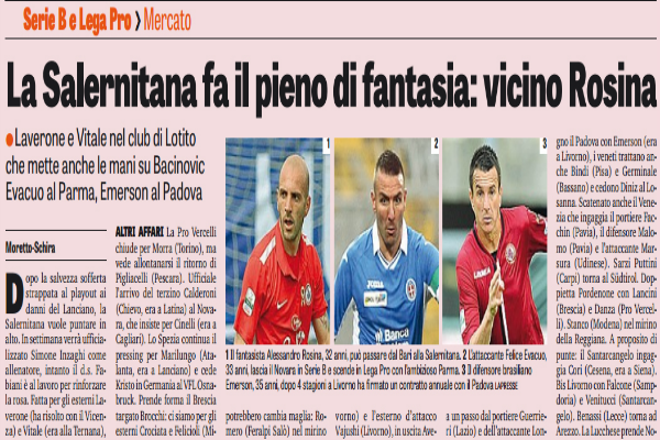 “Dopo la salvezza sofferta strappata al playout ai danni del Lanciano, la Salernitana vuole puntare in alto. In settimana verrà ufficializzato Simone Inzaghi come allenatore, intanto il d.s. Fabiani è al lavoro per rinforzare la rosa. Fatta per gli esterni Laverone (ha risolto con il Vicenza) e Vitale (era alla Ternana), ora il club del duo LotitoMezzaroma è ai dettagli per il mediano Bacinovic (Lanciano) e stringe per il fantasista Rosina (Catania, era a Bari), per la porta è duello con lo Spezia per Cragno (Cagliari, era a Lanciano). ALTRI AFFARI La Pro Vercelli chiude per Morra (Torino), ma vede allontanarsi il ritorno di Pigliacelli (Pescara). Ufficiale l’arrivo del terzino Calderoni (Chievo, era a Latina) al Novara, che insiste per Cinelli (era a Cagliari). Lo Spezia continua il pressing per Marilungo (Atalanta, era a Lanciano) e cede Kristo in Germania al VFL Osnabruck. Prende forma il Brescia targato Brocchi: ci siamo per gli esterni Crociata e Felicioli (Milan), oltre che per Cerri (Juventus, era a Cagliari). Il Vicenza in pressing per Acampora (Spezia). Continua a rinforzarsi il Pisa che ha l’accordo per il portiere Ujkani (Genoa, era a Latina) e il centrocampista Colombatto (Cagliari). Due attaccanti potrebbero cambia maglia: Romero (Feralpi Salò) nel mirino del Perugia; mentre il Benevento ci prova per Ferrari (Lanciano). Inizia a muoversi anche la Ternana: nel mirino ci sono il difensore Coppolaro (Udinese), il terzino Gasbarro (Livorno), i centrocampisti H’Maidat (Roma, era a Ascoli) e Cazzola (Livorno) e l’esterno d’attacco Vajushi (Livorno), in uscita Avenatti che è richiesto dal Leeds. Ufficiale il ritorno del portiere Bardi (Inter) a Frosinone. Il Bari ha ufficializzato Stellone come nuovo tecnico (contratto biennale con opzione per il terzo anno) e tratta Piu (Empoli). Due innesti per il Trapani che è a un passo dal portiere Guerrieri (Lazio) e dell’attaccante Longo (Inter, era a Frosinone): entrambi arriveranno in prestito. LEGA PRO Il Parma piazza il colpo Evacuo (Novara) in attacco e ci prova per il centrocampista Scavone (Pro Vercelli). L’altro acquisto roboante lo mette a segno il Padova con Emerson (era a Livorno), i veneti trattano anche Bindi (Pisa) e Germinale (Bassano) e cedono Diniz al Losanna. Scatenato anche il Venezia che ingaggia il portiere Facchin (Pavia), il difensore Malomo (Pavia) e l’attaccante Marsura (Udinese). Sarzi Puttini (Carpi) torna al Südtirol. Doppietta Pordenone con Lancini (Brescia) e Danza (Pro Vercelli). Stanco (Modena) nel mirino della Reggiana. A proposito di punte: il Santarcangelo ingaggia Cori (Cesena, era a Siena). Bis Livorno con Falcone (Sampdoria) e Venitucci (Santarcangelo). Benassi (Lecce) torna ad Arezzo. La Lucchese prende Nobile (Matelica) e tratta Pirrone (Pavia). Gelli (Livorno) torna al Tuttocuoio che vuole Esposito (Salernitana). Ufficiali Liviero (Lecce) e Esposito (Rimini) alla Juve Stabia). Il Messina tessera Ferri (Roma)”. Questo quanto si legge sull’edizione odierna de “La Gazzetta dello Sport”.