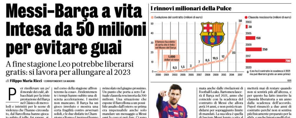 Gazzetta dello Sport: “Messi-Barça a vita. Intesa da 50 milioni per evitare guai”