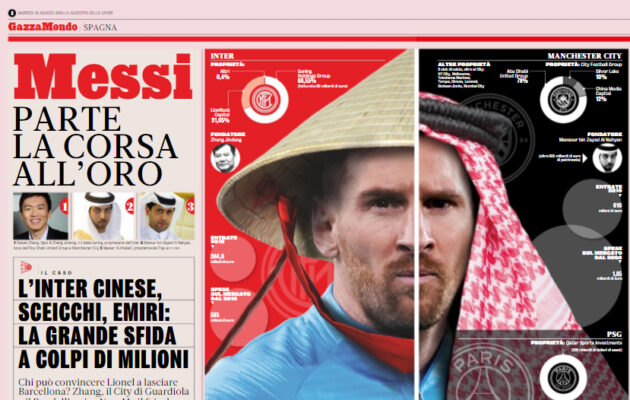 L’edizione odierna della “Gazzetta dello Sport” si sofferma sul futuro di Lionel Messi. Il fuoriclasse riflette nel silenzio, ma il tempo è tiranno. Il suo rapporto con Bartomeu è ai minimi storici. Sembra che il presidente voglia ingaggiare Neymar per rassicurarlo, però non si sa bene con quali soldi visto che nella cassa del Camp Nou non c’è un euro. Forse è più probabile che sia Messi a raggiungere Neymar al PSG. L’altra possibilità è quella del Manchester City. L’Inter parte in handicap rispetto alle avversarie, considerando la voglia di Messi di vincere subito la Champions League.