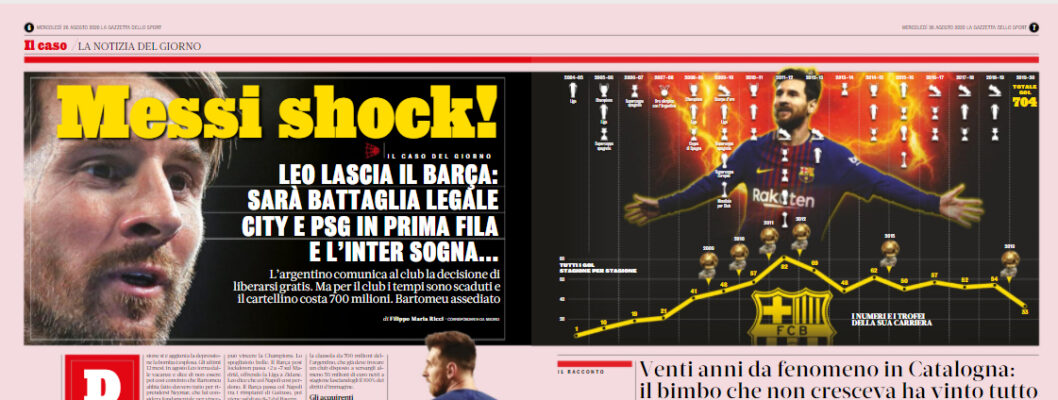 Gazzetta dello Sport: “Messi shock. Leo lascia il Barça. Sarà battaglia legale. City e PSG in prima fila. E l’Inter sogna”