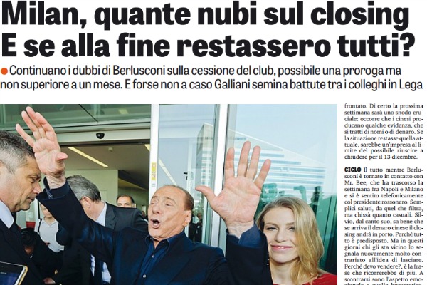 “Il countdown verso il fatidico 13 dicembre, data annunciata per il closing della vendita del Milan ai cinesi, scorre inesorabilmente e più si avvicina l’ora X più le nubi si addensano sull’operazione, anziché diradarsi. Sembra un paradosso ma è così. Il fatto che non siano ancora arrivate le autorizzazioni di Pechino per il trasferimento dei 420 milioni necessari all’acquisto da parte del fondo d’investimento SinoEurope Sports (dopo i 100 versati come anticipo) ha alimentato una serie di dubbi, sfociati nelle dichiarazioni di Berlusconi. Ma non è soltanto questo. È la natura stessa dell’operazione suggellata nel preliminare del 5 agosto ad aver adombrato perplessità che adesso, proprio a ridosso del closing, stanno tornando a galla: il regista dell’acquisizione, Li Yonghong, non è un personaggio di primo piano della finanza cinese, non pare avere una consistenza patrimoniale adeguata ed è praticamente sconosciuto da quelle parti; l’acquirente non è una realtà industriale o un businessman noti, ma un fondo d’investimento che tradisce la natura finanziaria, speculativa dell’affare Milan; i nomi degli investitori non sono ancora stati rivelati a Fininvest, con una sfilza di colossi cinesi prima presenti in lista e poi scomparsi e con la sola conferma dello stesso Li Yonghong e di Haixia Capital, che non è un fondo di Stato bensì è controllato al 40% dalla provincia di Fujian.