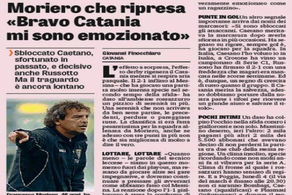 “Sbloccato Caetano, sfortunato in passato e decisivo anche Russotto. Ma il traguardo è ancora lontano. L’effetto sorpresa, l’effetto derby rigenera il Catania mentre si respira aria pasquale. Il 2-1 inflitto al Messina ha dato all’ambiente rossazzurro un pizzico di serenità in più. Una serenità che mancava da ben sette partite, le precedenti, perdute o pareggiate tutte. La classifica si era fatta pesantissima per la squadra allenata da Moriero, anche se adesso con tre punti in più non è che sia migliorata di molto a dire il vero. […]”. Questo quanto scrive l’edizione odierna de “La Gazzetta dello Sport”